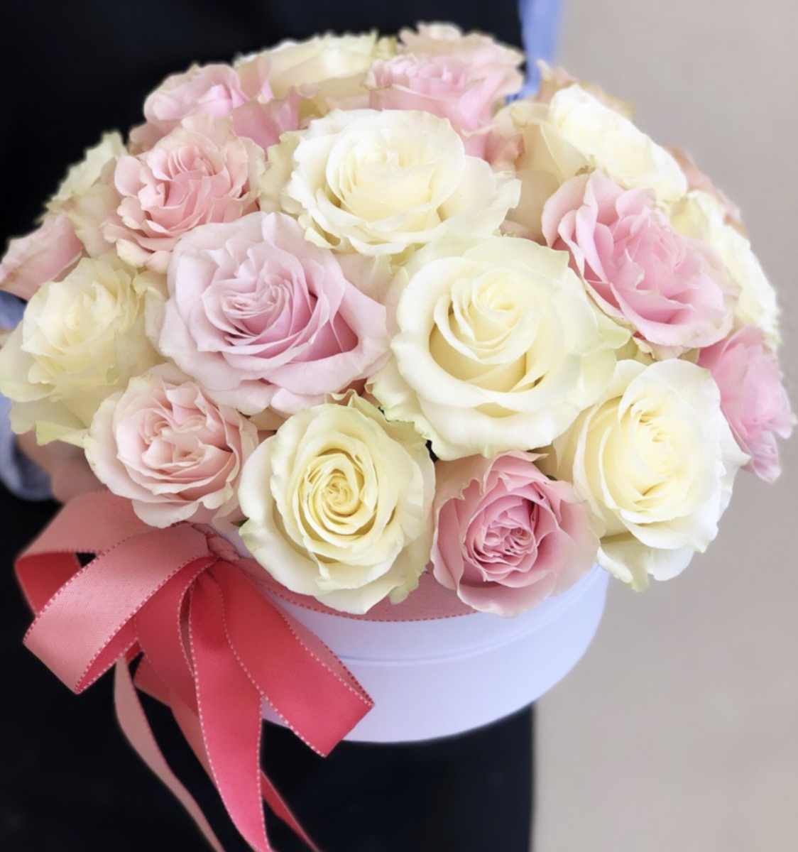 Состав: Роза белая (10), роза розовая (15), Коробка цилиндр (1), оазис
